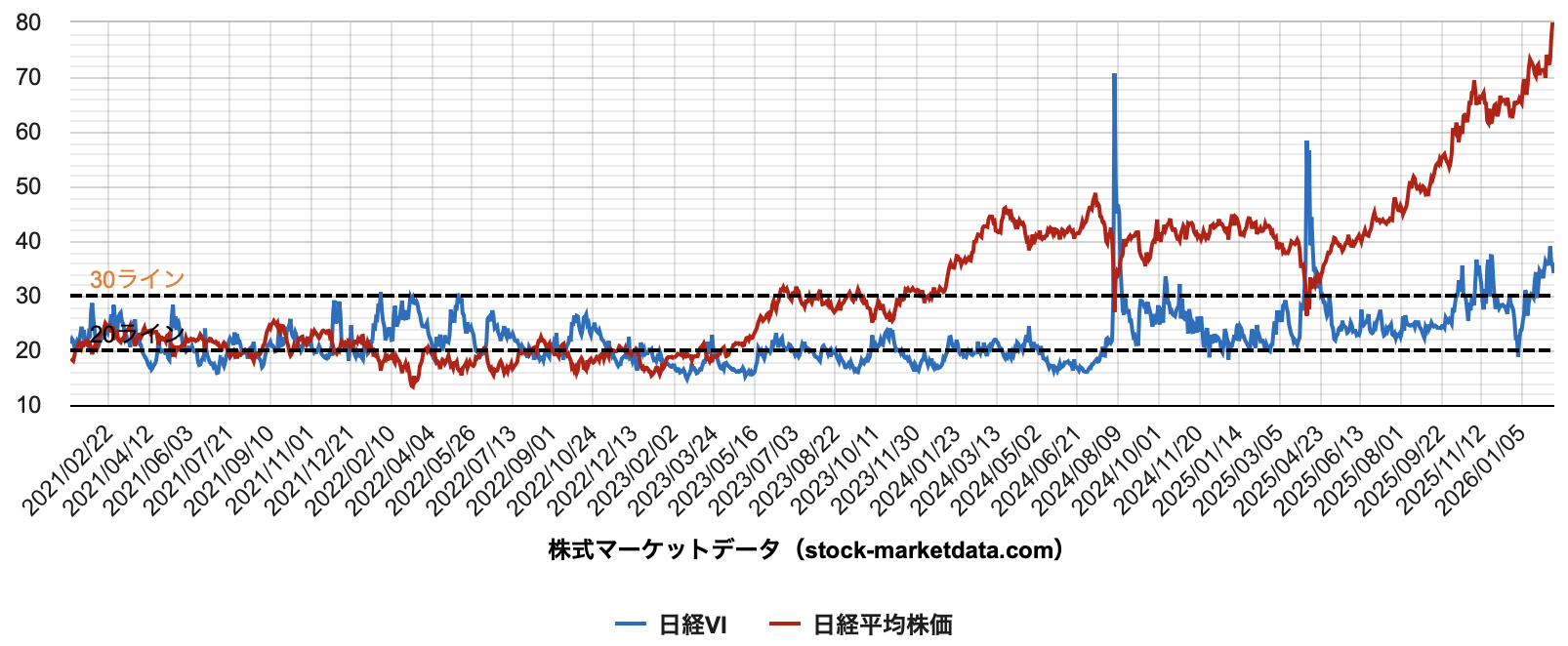 上のチャートは日経VIだが、高市さんの解散表明の前は26%だったが、選挙戦突入、選挙情勢が判明した2月6日には39%まで上昇した。