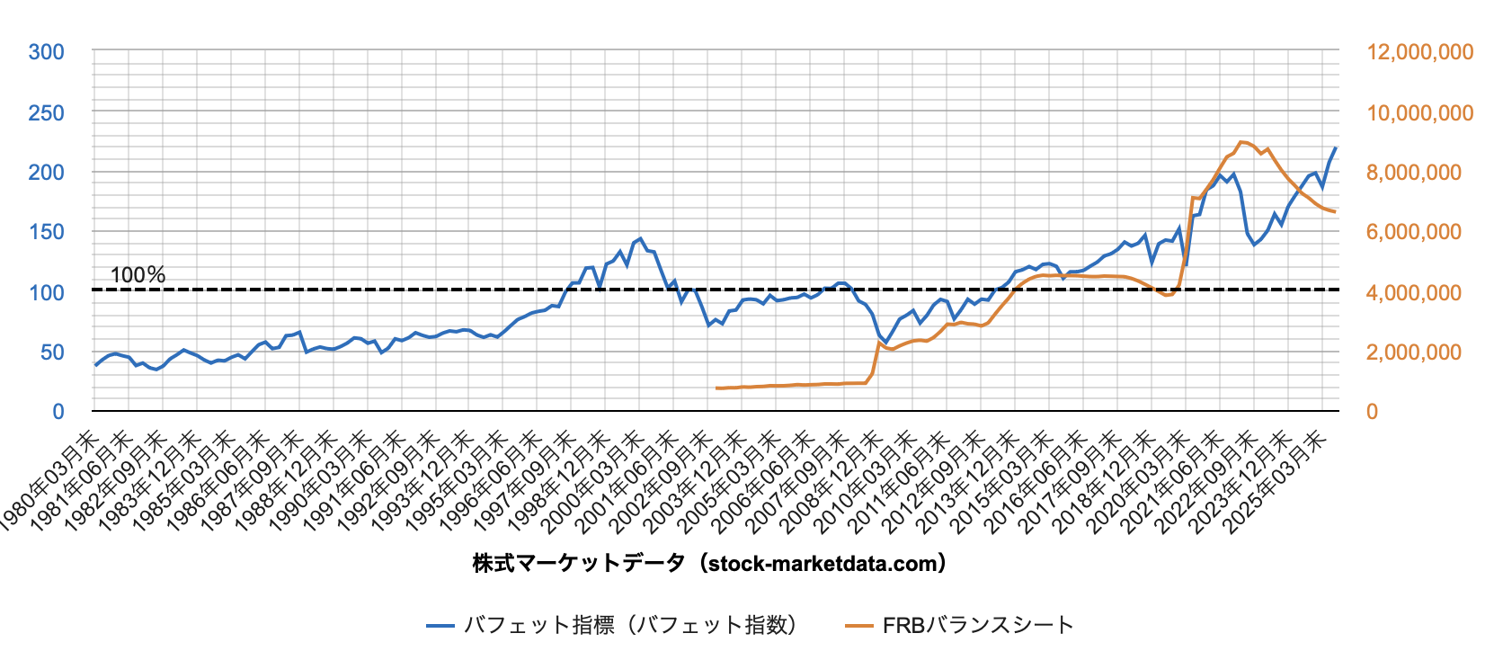 2025年にはこのバフェット指標が200%を越えてきた。